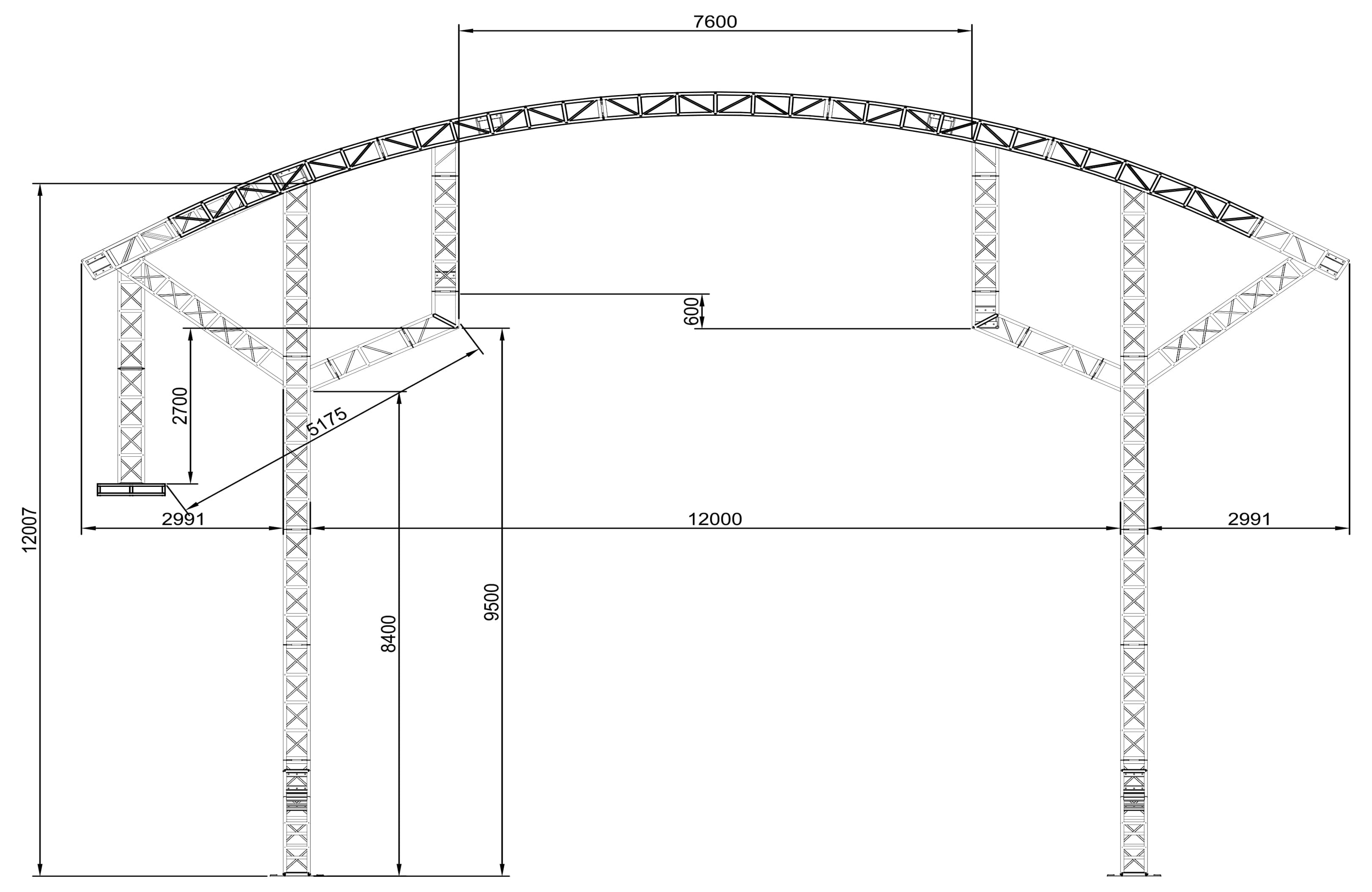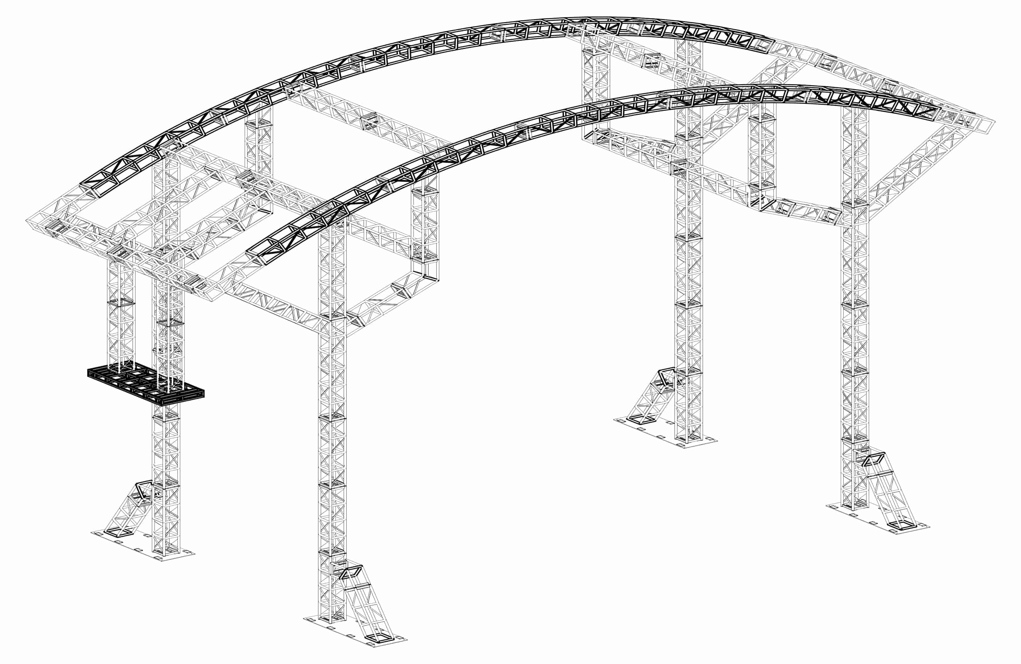 This 18m*5m*12m curved truss structure is customized for acrobatic performances. According to the customer's requirements, the left side of the structure must be 60cm higher than the right side, and the hanging parts on both sides must be 8m apart.